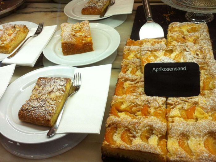 Green velour chairs and highly polished table tops are accompanied by the slightly annoying, yet familiar exchange of having to decide which cake or torte you’d like from a superb selection, depleting by the minute, just out of sight in the chilled counter. They aren’t reliably listed on a menu, so it’s a memory game, as you dart from your chair, back to the table and the hovering host with notepad poised, but its all part of the fun. Carefully tended by curious and smiling staff, house and regional specialities, such as Hazelnut Cake (Haselnuss Spezial Torte) and an Apricot Sponge Tray Cake (Aprikosen Sandkuchen), sit alongside undeniable German classics at Café Jansen.